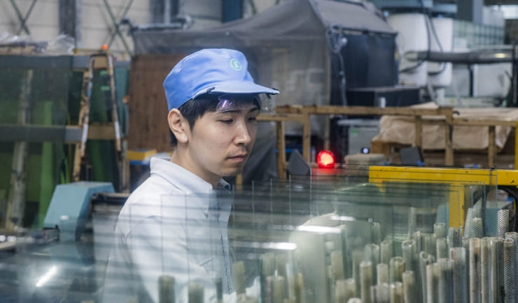 産業の板ガラス製品を生産しています。製品が完成するまでには色々な工程がありますが、それらはロボットや大型設備の操作から手作業による繊細な業務まで多種多様。社員たちで分担しながら、製品を作り上げます。