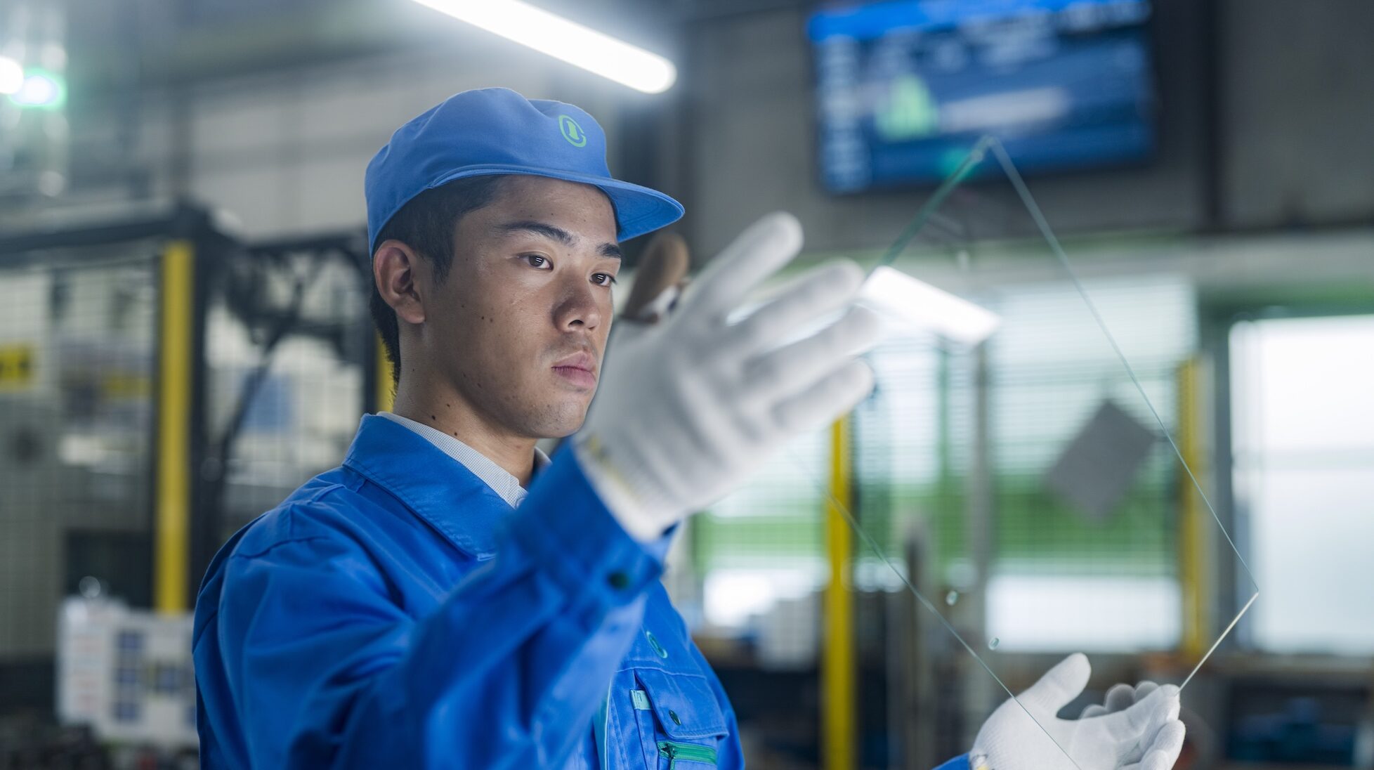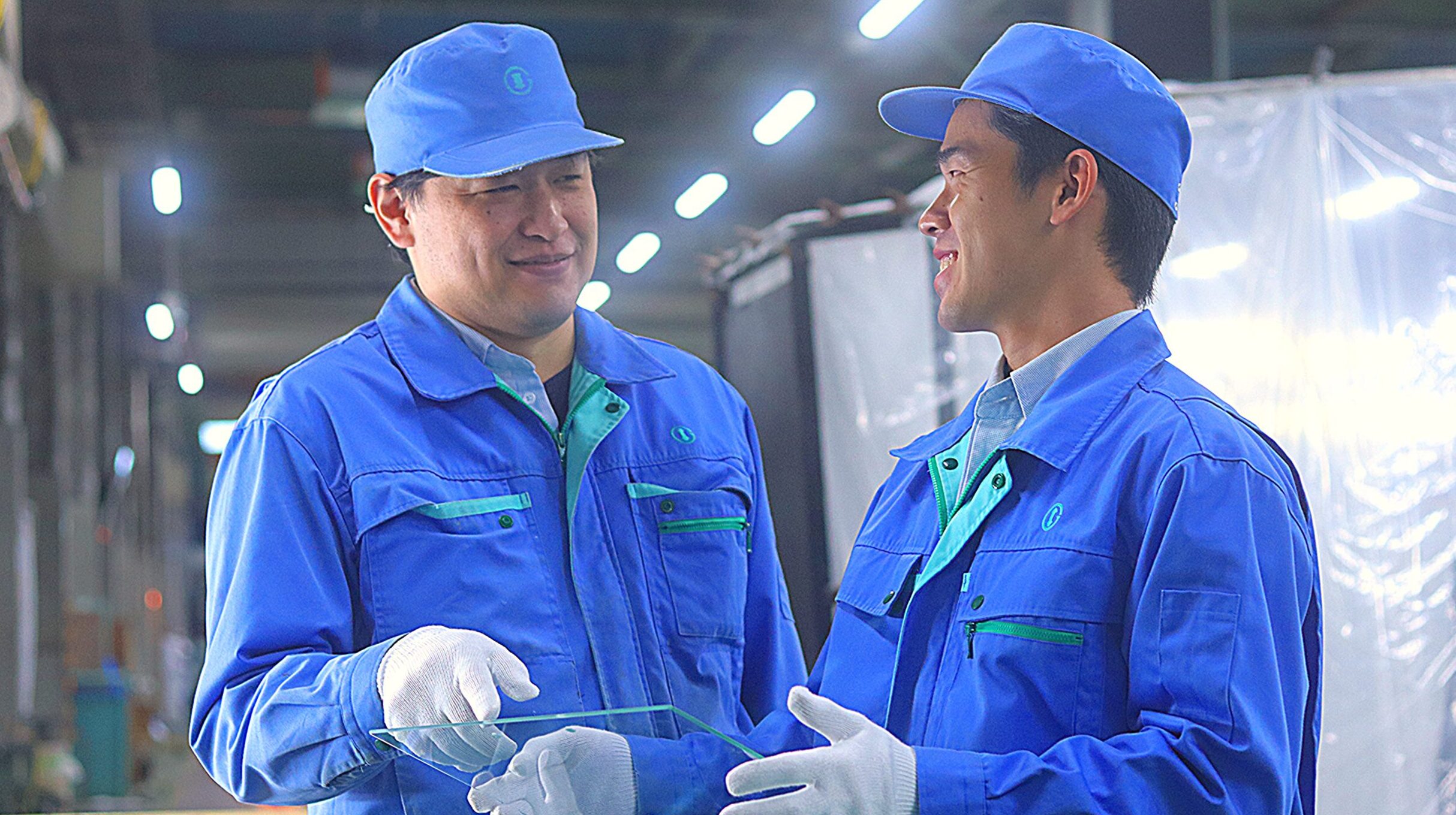 川越工場で産業用の板ガラス製品を生産しています。完成品に至るまでには、ロボットや大型設備の操作から、手作業による繊細な加工まで多岐にわたる工程があります。それぞれの工程で精密さやスピードが求められ、品質を保つためには自分自身の集中力とチームみんなの協力、この2つが欠かせません。